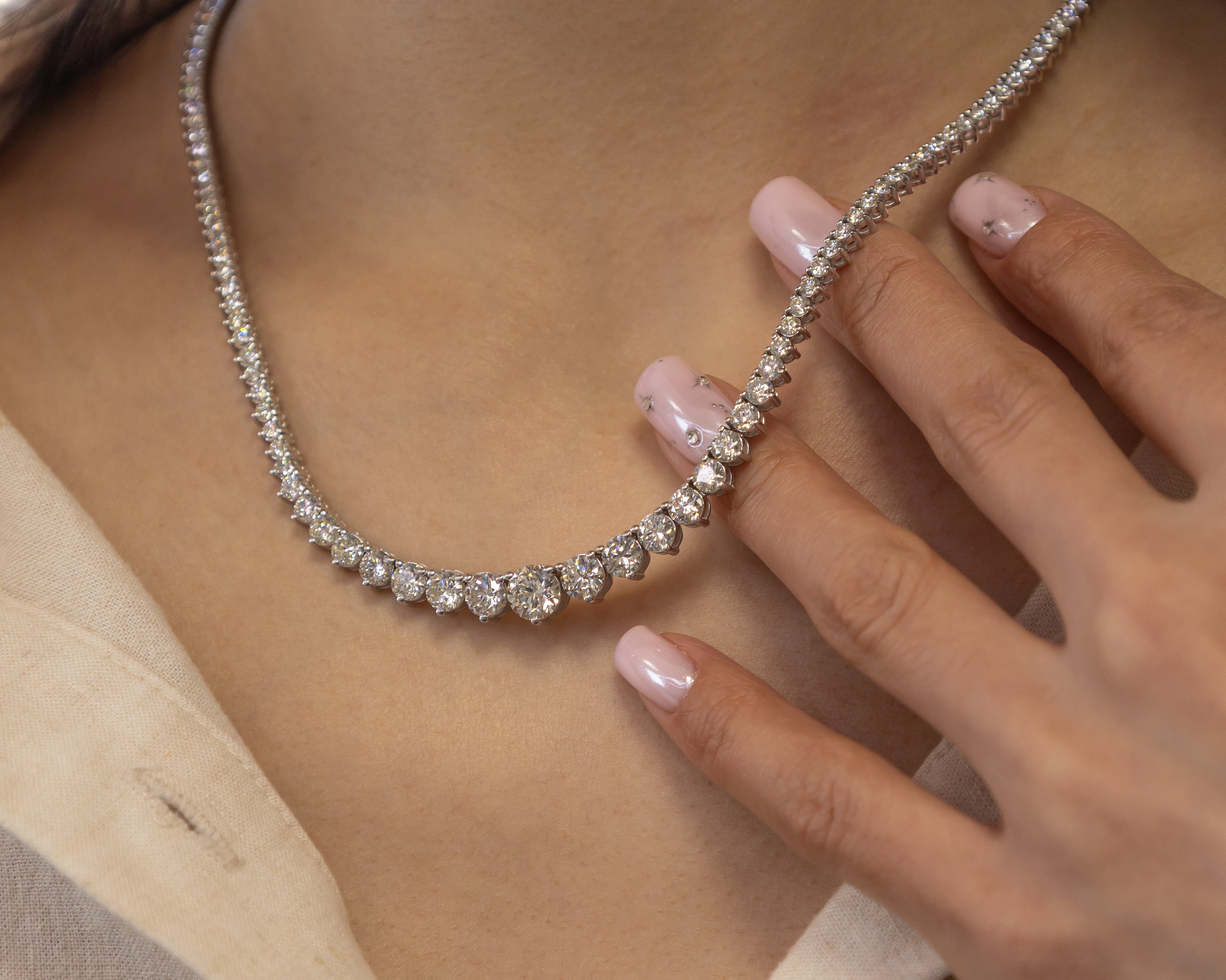 A timeless expression of luxury, this graduated Riviera necklace showcases the brilliance of 161 natural diamonds, meticulously set to create an unbroken river of light. The perfect balance of sparkle and sophistication, it sits gracefully at the collarbone for a statement that is both bold and refined.