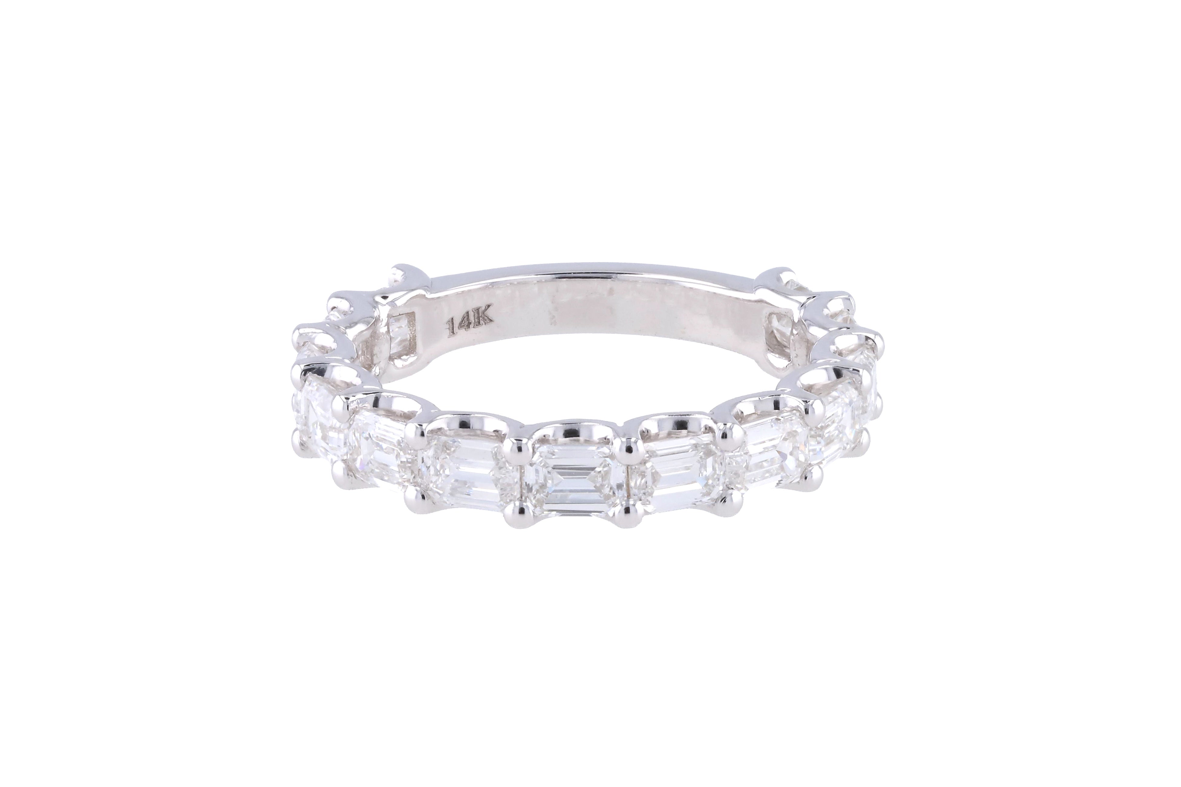 Elevate your stack with a modern twist on timeless brilliance. Our East/West Diamond Band in 14K white gold reimagines classic elegance with a contemporary silhouette. Set with hand-selected diamonds in a sleek ¾ eternity design, each stone is thoughtfully positioned in an East/West orientation to maximize light and lend a unique horizontal flow across the finger.