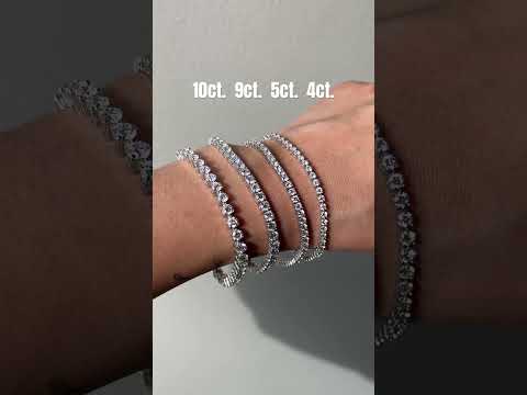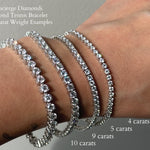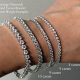 Available to be customized in almost any desired total carat weight, the examples pictured here include 4, 5, 6, 8, and 9 carat bracelets. These tennis bracelets are set in 14K white gold, set with stunning natural diamonds.