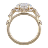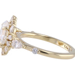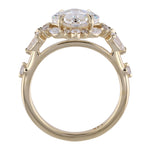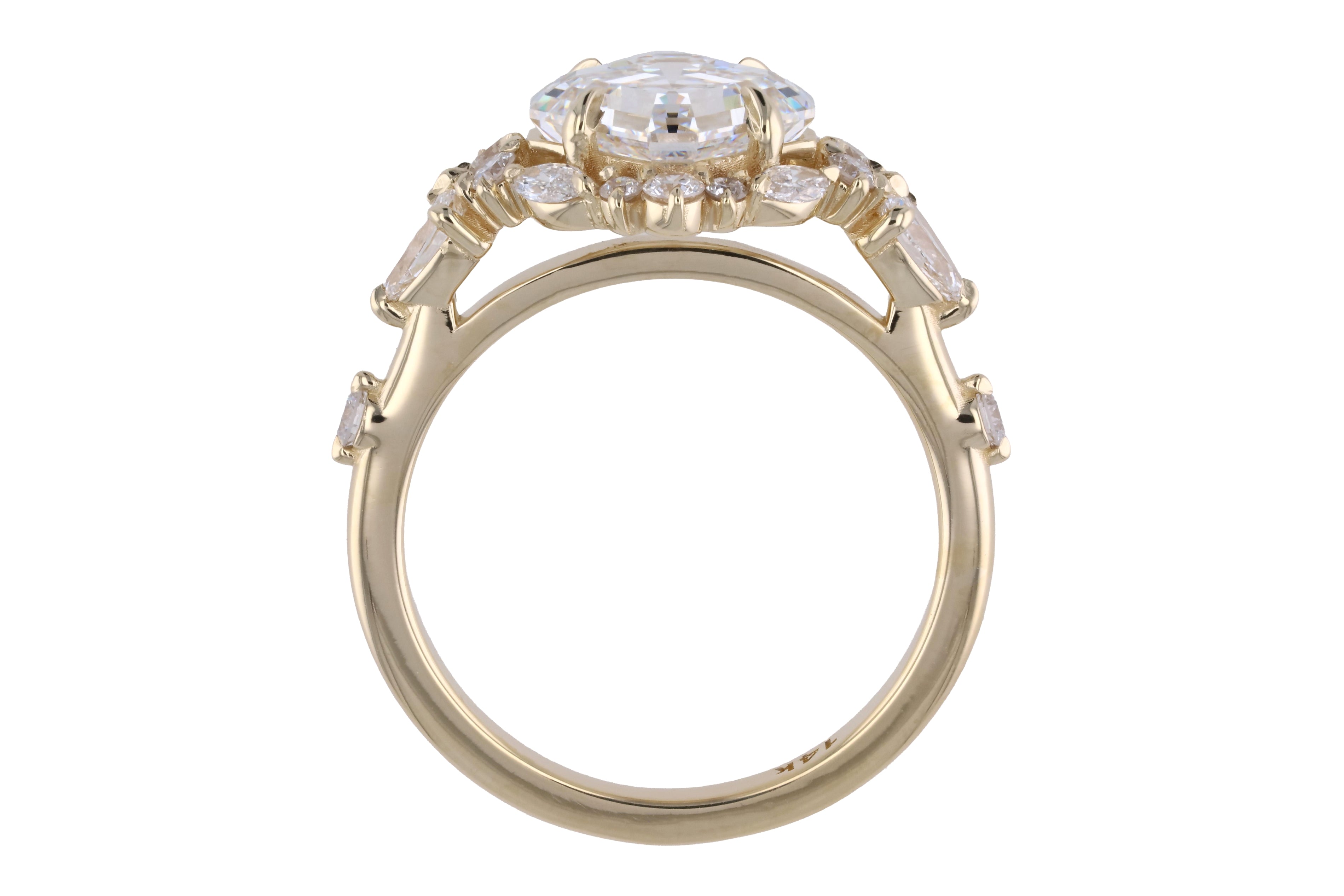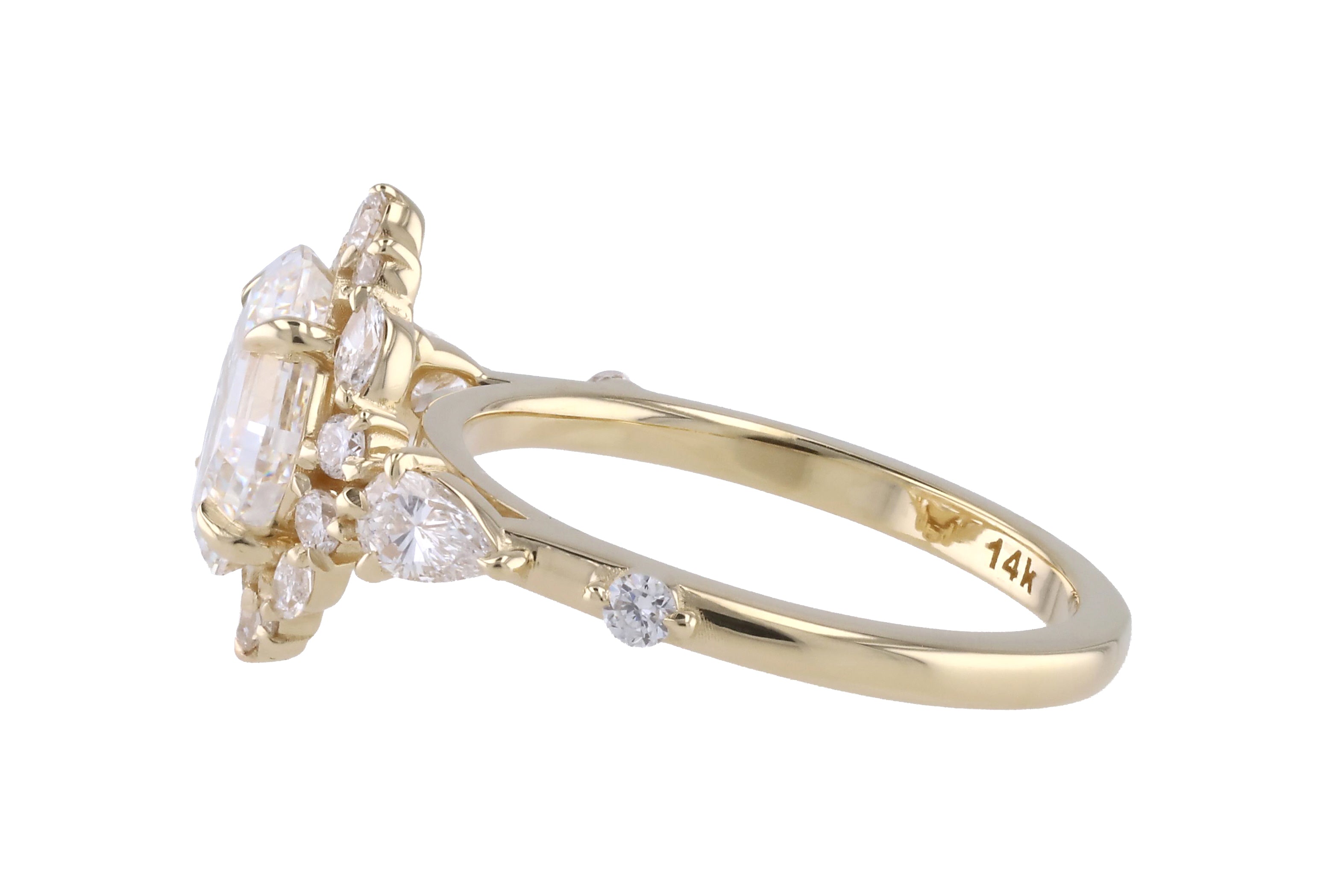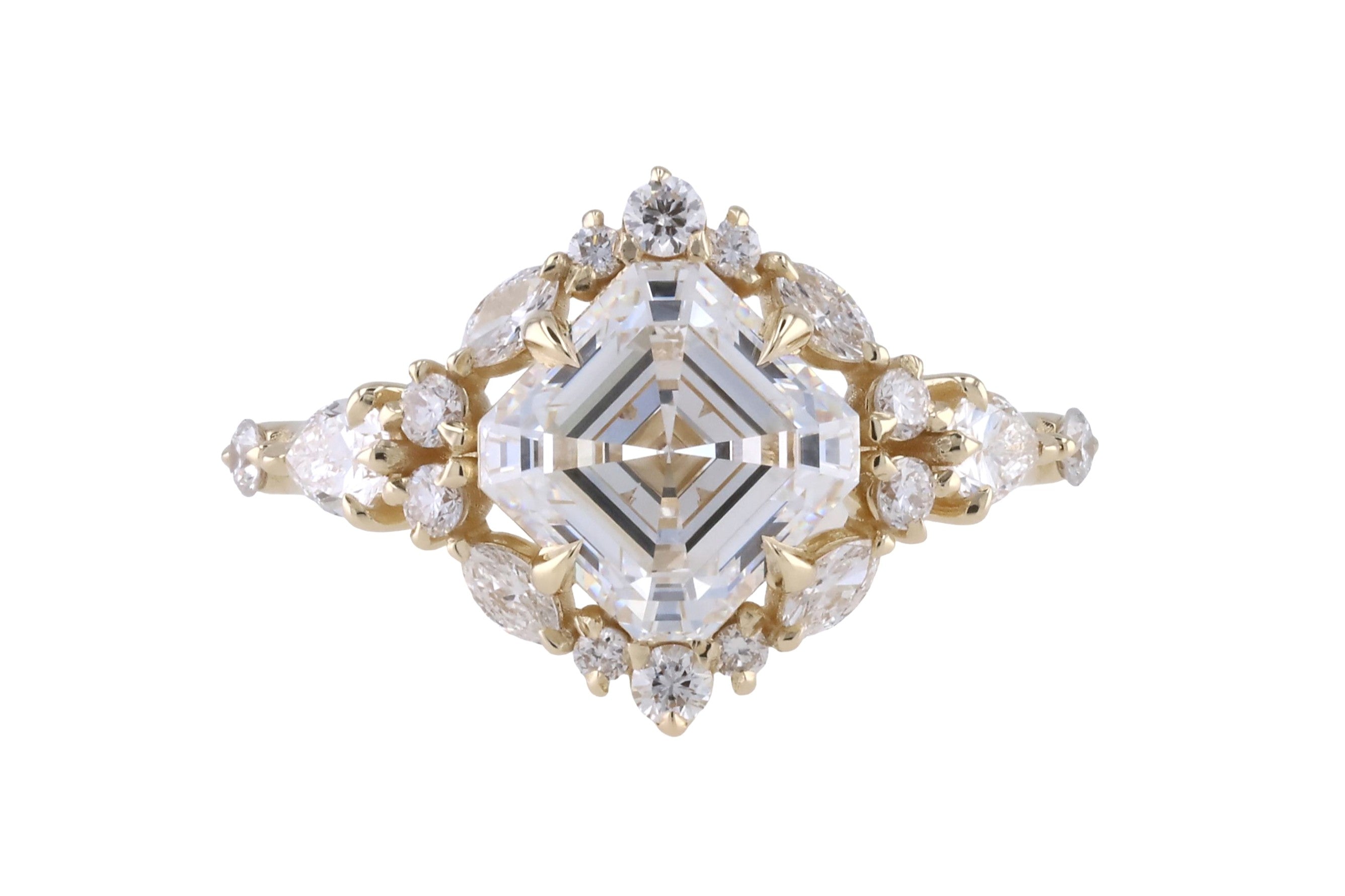 A striking custom design featuring a kite-set Asscher-cut center stone held by eight refined claw prongs—one on each corner and side. Accented with delicate pear-shaped diamonds on the East and West, complemented by clustered round melee near the tips. A halo of varied-size round melee encircles the center, each secured with bold claw prongs. The shank features a subtle gap after the cluster, with a single round melee inset further along the band for a touch of modern symmetry.