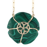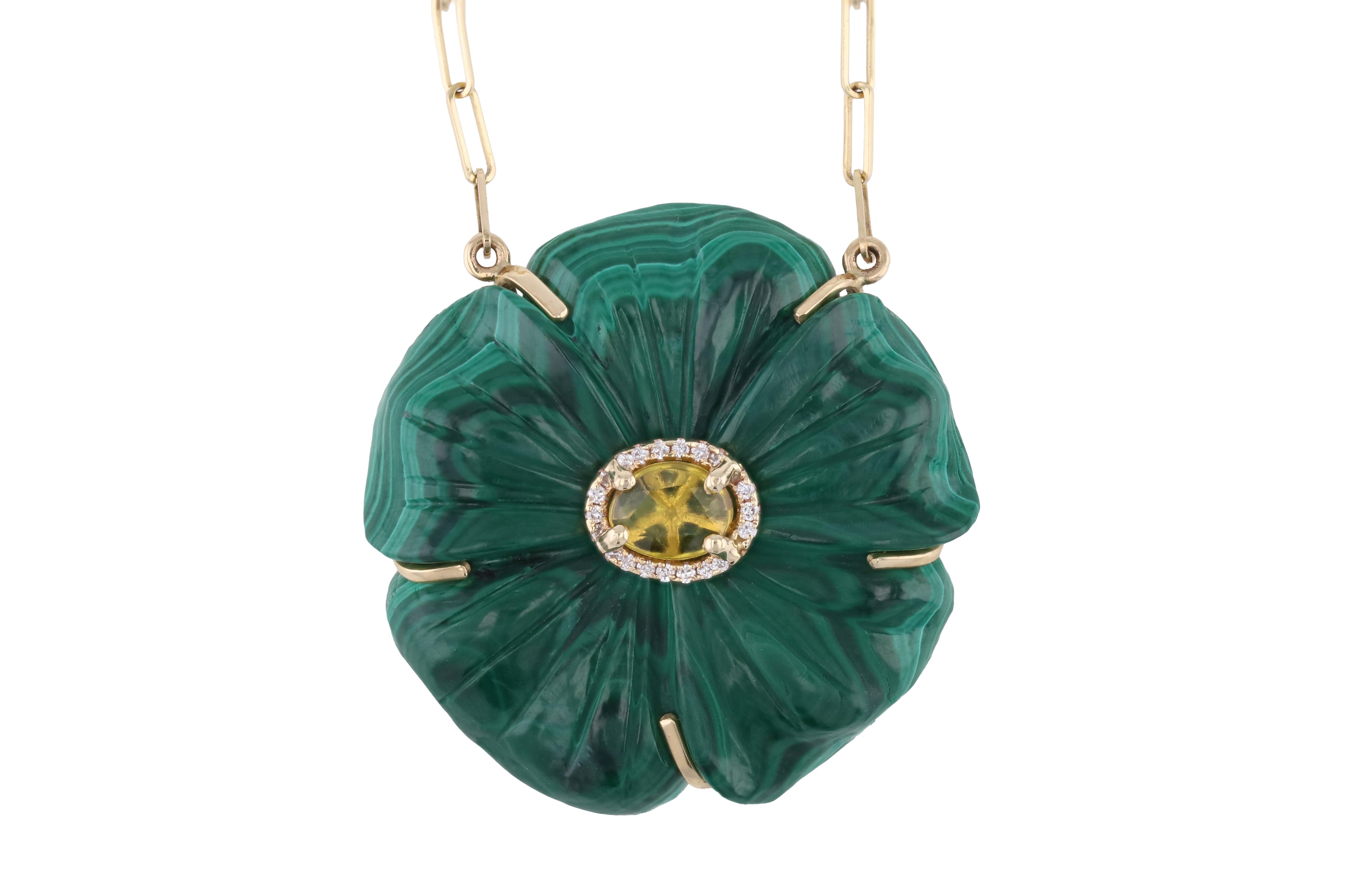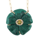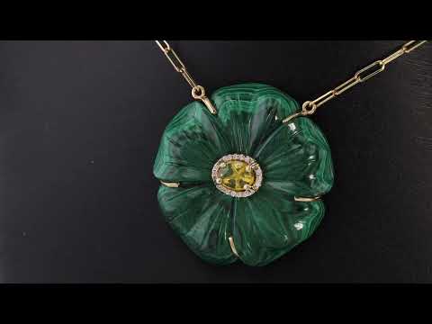 A celebration of color and refined craftsmanship, the Evergreen Necklace features a hand-carved malachite flower brought to life by a glowing yellow sapphire center. A delicate diamond halo adds sparkle and depth, while the 14k yellow gold setting enhances the piece’s rich, natural tones. Elegant on its own or layered, this vibrant floral pendant is designed to make a lasting impression.