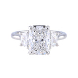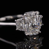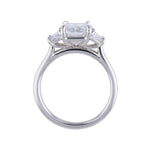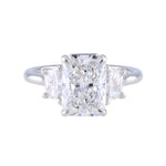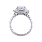 This Lab-Grown White Diamond Platinum Engagement Ring features a stunning, brilliant-cut white diamond center stone set in a three-stone, one-of-a-kind platinum setting. Four prongs elegantly hold each diamond in place.