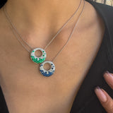 This circle of life emerald and diamond pendant features pave diamonds and milgrain detailing. This pendant comes in a variety of material types like 14k white gold, yellow gold, rose gold and can be customized. These gemstone pendants are perfect for that special someone in your life.