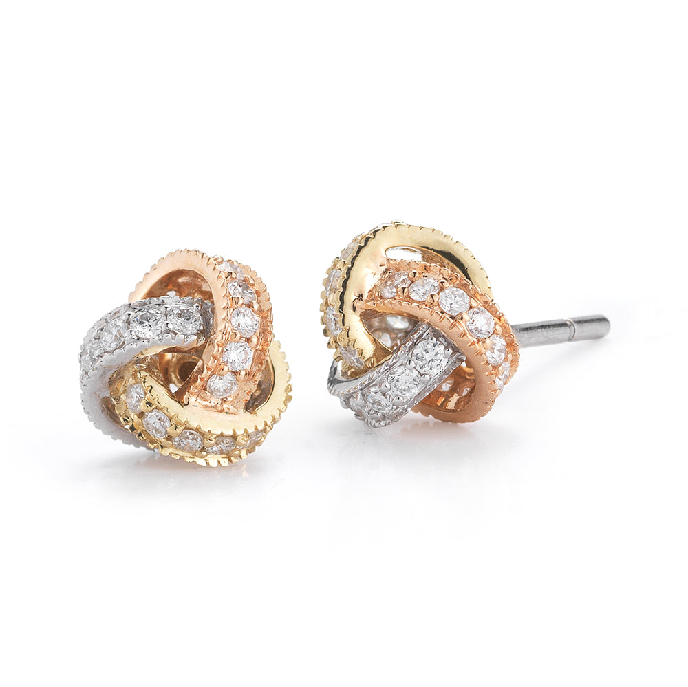 14K Tri-Color Pave Diamond Love Knot Stud Earrings