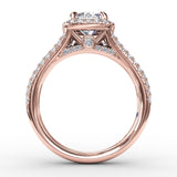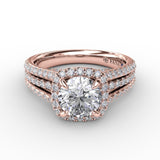 Cushion-Shaped Diamond Halo Engagement Ring With Triple-Row Diamond Band