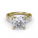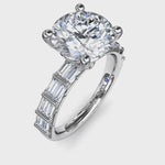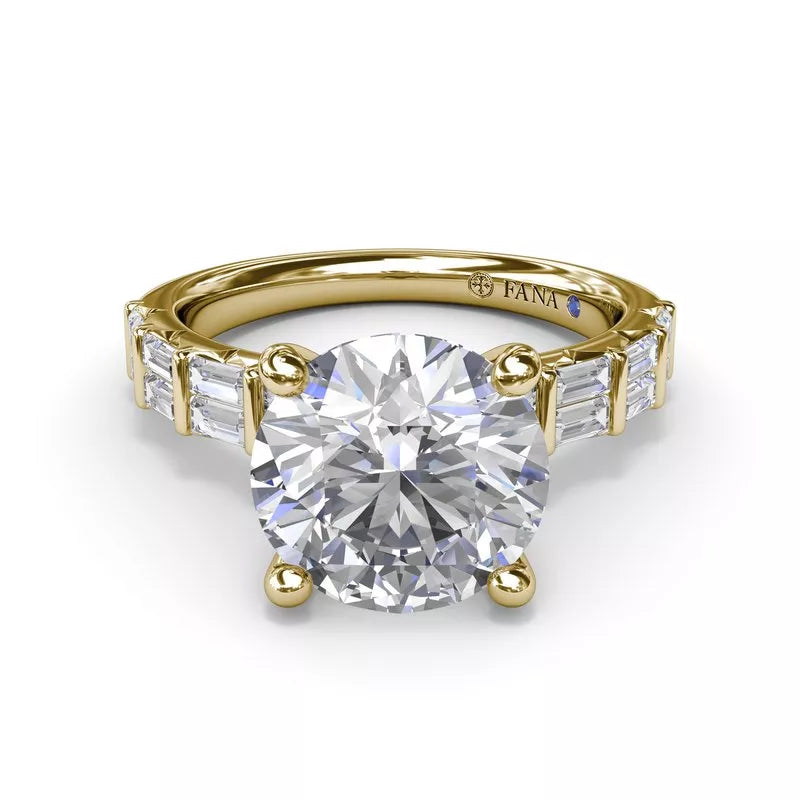 Straight baguettes set tight in a double row allow this beautiful engagement ring maximum light and sparkle. This design can be customized based on stone shape and metal preference.