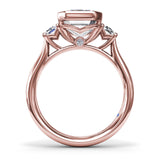 Bezel set center stone and straight baguette side stones paired with a straight bar setting complete this modern three stone engagement ring. This design can be customized based on stone shape and metal preference
