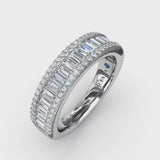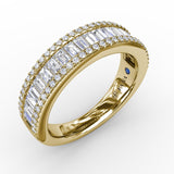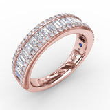 An enthralling row of baguettes is bordered by two rows of pave round diamonds. This fashion band can be special ordered in any finger size, in Platinum, 18KT & 14KT gold.